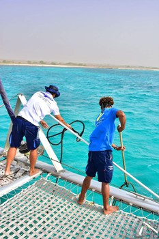 Scenic sailing: we will set sail in a cayuco to the anchored catamaran and sail along the spectacular coast of Cape Verde. You will enjoy panoramic views of golden beaches, volcanic cliffs, and spectacular waters. During the trip, you will be able to observe the vibrant marine life, and occasionally playful dolphins, at certain times of the year.