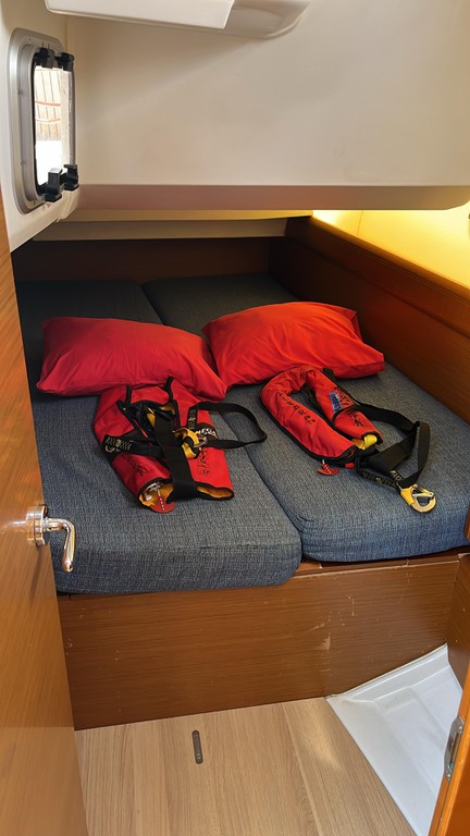 Autopilot, Binoculars, Gps, Plotter, Vhf radio, Speedometer, Sailsrepair kit, Hand bearing compass, First aid kit, Inflatable life raft, Navigation lights.