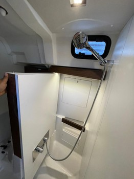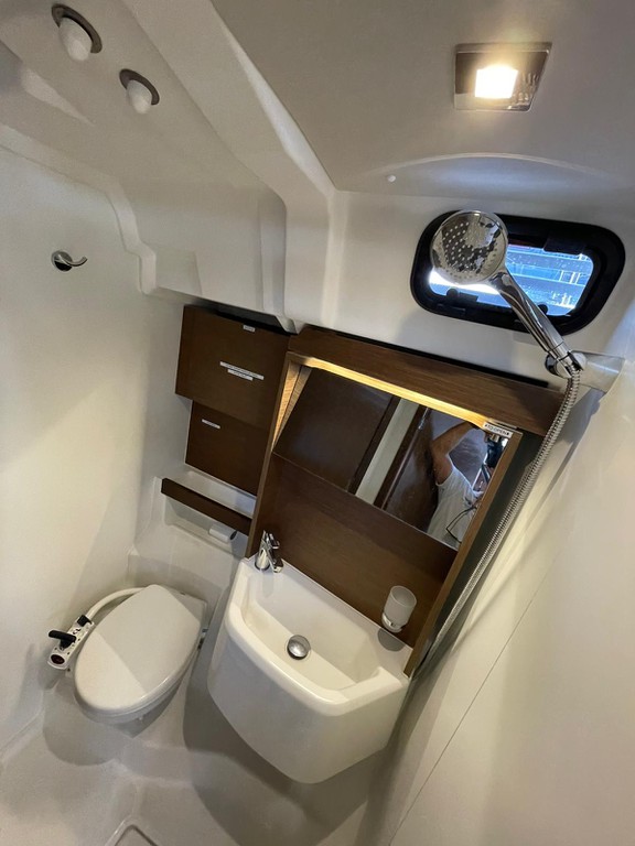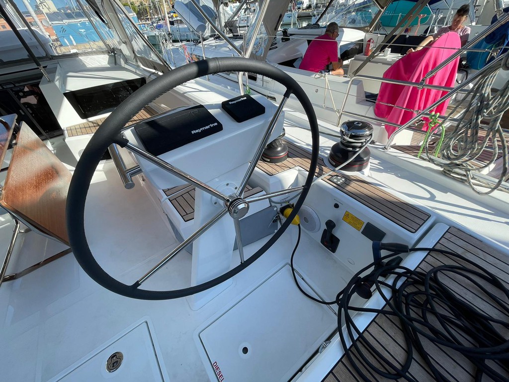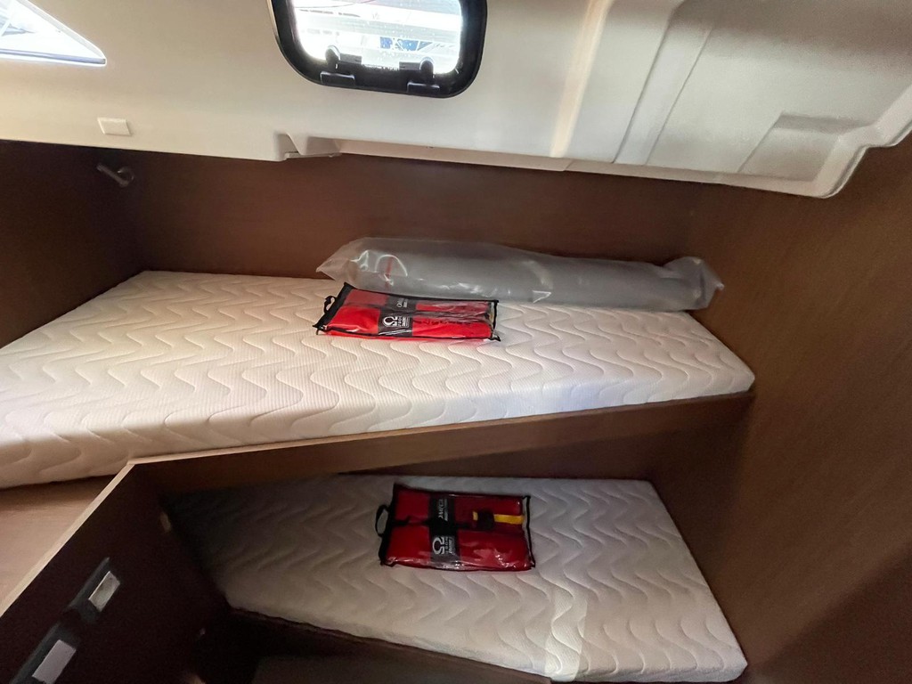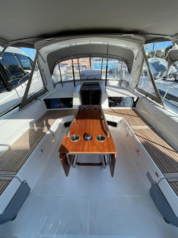 Bimini, Hélice de proa, Altavoces de bañera, Mesa de cabina, Embarcación auxiliar, Mayor con sables, Ducha exterior, Génova enrollable, Capota antirociones, Cubierta de madera de teka, Escalera de baño, Bomba de achique eléctrica.